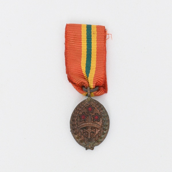 • Medalha de Sangue do Brasil criada por intermédio do Decreto-Lei nº 7.709, de 5 de julho de 1945 com o objetivo de a agraciar oficiais, praças, assemelhados e civis, destacados para o teatro de operações na Itália(II GM), e que ali tivessem sido feridos em consequência de ação objetiva do inimigo. O decreto-lei foi promulgado por Getúlio Vargas. Medalha confeccionada em  bronze, possui as seguintes características: Anverso: Sabre das Armas da República. Três estrelas vermelhas representando os três ferimentos recebidos pelo General Sampaio, no dia 24 de maio de 1866, na Batalha de Tuiuti  Guerra do Paraguai. Dois ramos de "Pau Brasil", orlando a medalha, lembram a Pátria e as origens de seu nome glorioso. Uma faixa arqueada está inscrita  Sangue do Brasil. Reverso: esfera da Bandeira Nacional envolvida pelos dois ramos de "Pau Brasil". A fita é de cor vermelha com um friso central, dividido em três partes iguais com as cores nacionais: amarelo, verde, amarelo. Estado conforme fotografias. Medidas: Medalha: Alt.: 2 x Comp.: 1,9 cm. Comp.: 5 cm.