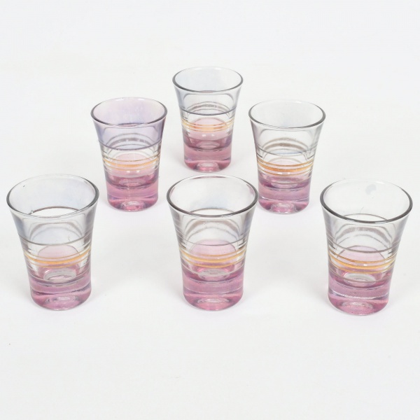 • VIDRO, seis (6) copos para licor, ligeiramente obcônicos, translúcidos, ornados com faixas horizontais, arremates a ouro, marca NADIR FIGUEIREDO (fundada em 1912 em São Paulo, como oficina para máquina de escrever; em 1943 comprou a fabrica de louça Santa Rita que ficou ativa até 1950; em 1944 comprou as fazendas Santa Terezinha e Fortaleza, onde construiu uma nova fábrica chamada Vila Operária que começou a operar em 1948; em 1947 iniciou a produção do copo de vidro americano; em 1955 iniciou a produção de copo para envase de requeijão; registrou as seguintes marcas: em 1956 a KOPAL; em 1957 a ROSICLER e PIREFRAX; em 1979 a KERAMIK; em 1982 a POTTERY; em 1992 a DURAMIK; em 1993 encerrou a produção de louça), sinais de uso, vide foto.
