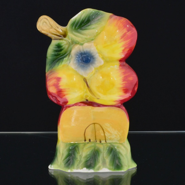 • ) LOUÇA, uma (1) floreira policromada, representando frutas, medindo 14 cm altura, sinais de uso, vide foto.
