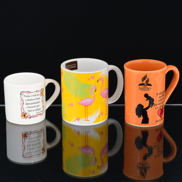 • LOUÇA E FAIANÇA, três (3) canecas distintas: 1 ornada com flamingos em policromia, brinde da Chocolates Cacau Brasil; 1 com propaganda da Igreja Adventista do Sétimo Dia, com dizeres enaltecendo a mãe; 1 com salmo Bíblico, trincada no fundo, todas com sinais de uso, vide foto, medindo a maior 9,5 cm altura.