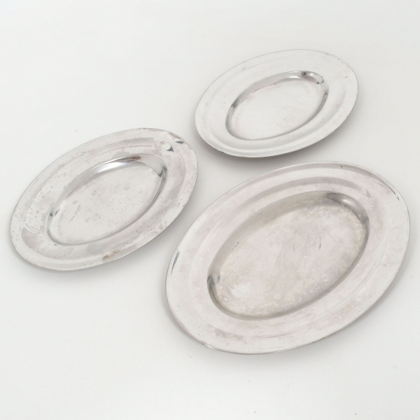 • AÇO INOX, três (3) travessas ovais, lisas, marca BARINOX, possui riscados, medindo: 21 x 15,5 cm (2) e 25,5 x 18 cm, todas com sinais de uso, vide foto.