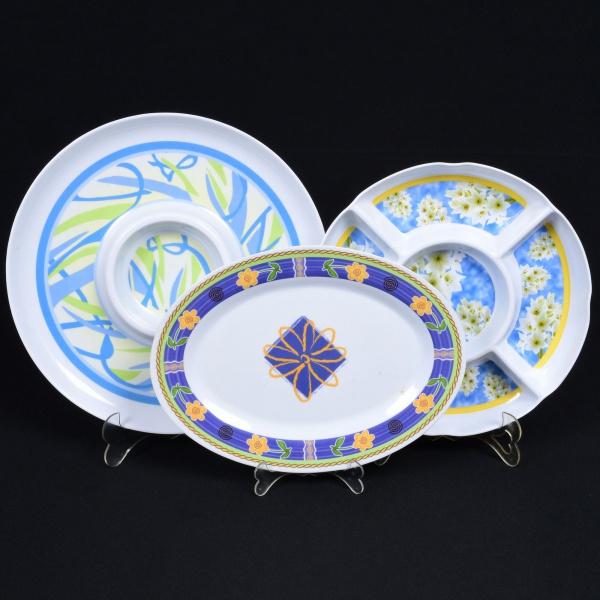 • DIVERSOS, três (3) petisqueiras distintas, confeccionadas em polímero, medindo a maior 32,5 cm diâmetro, sinais de uso, vide foto.