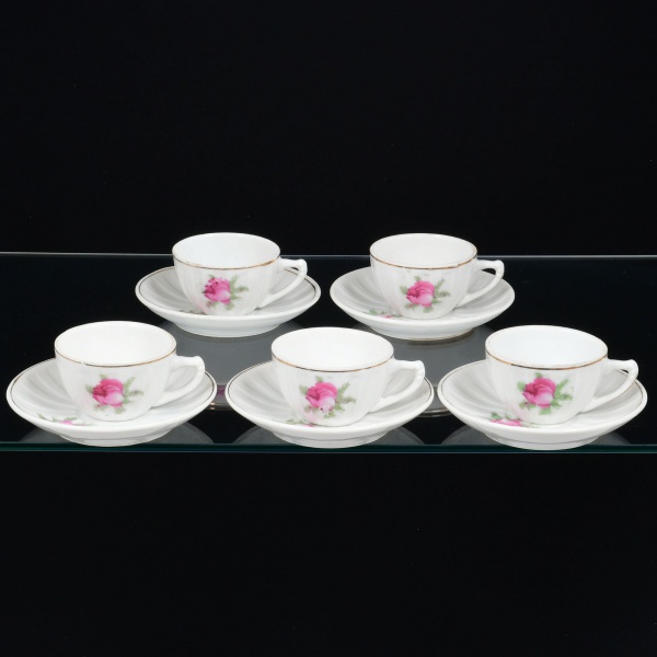 • PORCELANA, cinco (5) xícaras para café, com ornamentação floral policromada, arremates a ouro, modelagem canelada na vertical, sem marca de manufatura aparente, ideais para coleção de cristaleira, acompanha um pires sobressalente, sinais de uso, vide foto.