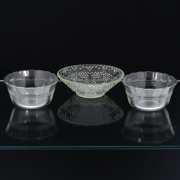 • VIDRO, três (3) taças para sobremesa, incolores e translúcidas, dois modelos distintos: 1 moldada em folhas e perolados, medindo 12,5 cm diâmetro; 2 moldadas em sulcos horizontais, borda canelada, marca PYREX, medindo 9,5 cm diâmetro, todas com sinais de uso, vide foto.