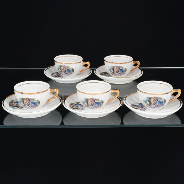 • PORCELANA, cinco (5) xícaras de café, ornadas com cena de galanteio em policromia, possivelmente baseada na obra de FRAGONARD (Jean Honoré Fragonard, Grasse 1732 Paris 1806, pintor, desenhista e gravurista francês, estilo Rococó, conhecido pela exuberância e hedonismo de sua obra, pinturas do gênero com atmosfera de intimidade e erotismo), arremates a ouro, modelagem canelada na vertical, sem marca de manufatura aparente, ideais para coleção de cristaleira, sinais de uso, vide foto.