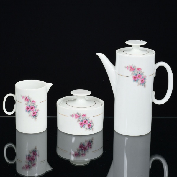 • PORCELANA, três (3) itens: 1 bule de café (pega da tampa quebrada); 1 açucareiro e 1 cremeira, ornamentação floral policromada, arremates com frisos a ouro, manufatura RENNER (Porto Alegre, RS, fundada em 1942; em 1998 foi vendida para a Vista Alegre de Portugal; em 1999 mudou a razão social para Vista Alegre do Brasil), medindo a maior peça 17 cm, sinais de uso, vide foto.