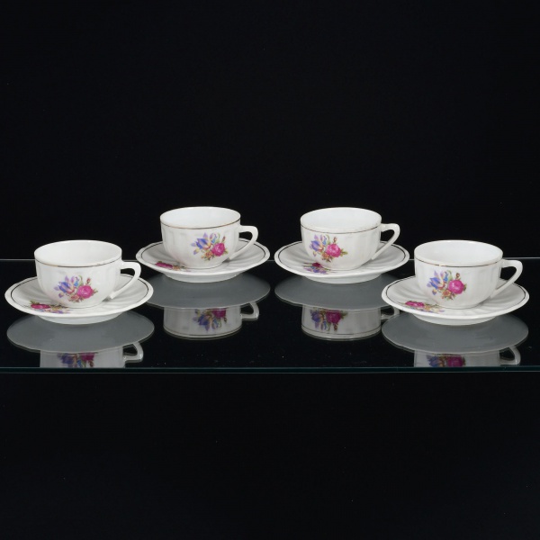 • PORCELANA, quatro (4) xícaras para café, com ornamentação floral policromada, arremates a ouro, modelagem canelada na vertical, sem marca de manufatura aparente, ideais para coleção de cristaleira, sinais de uso, vide foto.