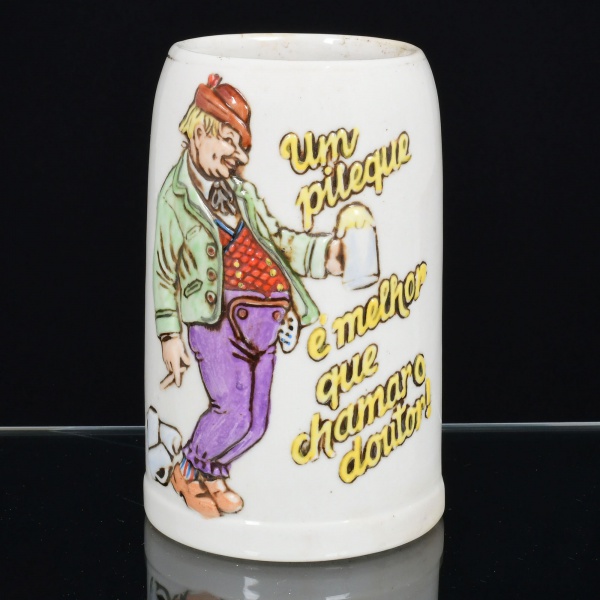 • LOUÇA, uma (1) caneca com figura caricata em policromia e a legenda: Um Pileque É Melhor Que Chamar O Doutor, manufatura CERAMARTE (Rio Negrinho, SC, fundada em 1956 pelo alemão Klaus Schumacher, ainda em atividade), medindo 11,5 cm altura, vide foto.