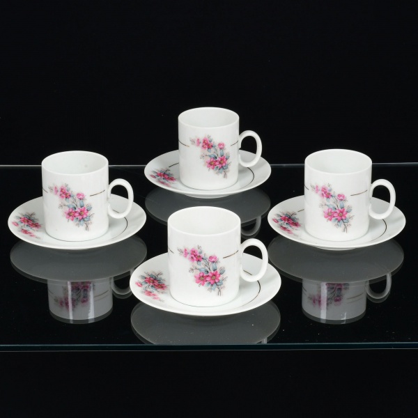 • PORCELANA, quatro (4) xícaras para café, faltando um pires, ornamentação floral policromada, arremates com frisos a ouro, manufatura RENNER (Porto Alegre, RS, fundada em 1942; em 1998 foi vendida para a Vista Alegre de Portugal; em 1999 mudou a razão social para Vista Alegre do Brasil), ideais para coleção de cristaleira, uma xícara com mancha na parte interna, sinais de uso, vide foto.