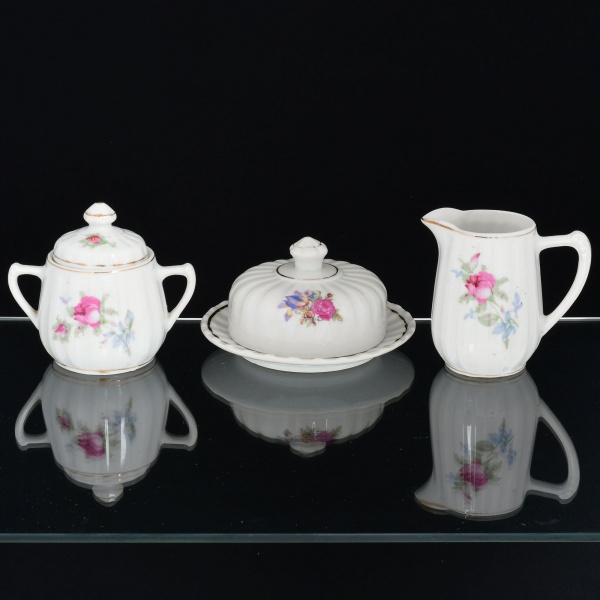 • PORCELANA, três (3) itens com ornamentação floral policromada, arremates a ouro, modelagem canelada na vertical, sem marca de manufatura aparente, sendo: 1 cremeira; 1 açucareiro e 1 manteigueira, medindo a maior peça 13,5 cm diâmetro, sinais de uso, vide foto.