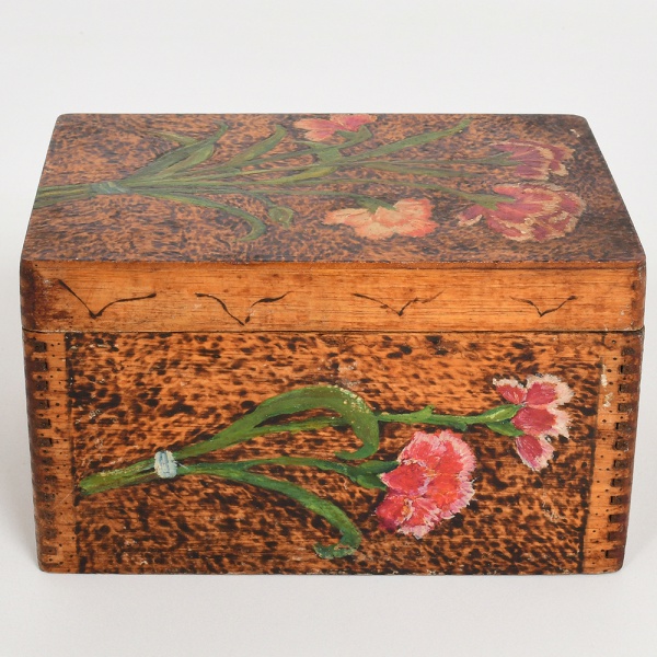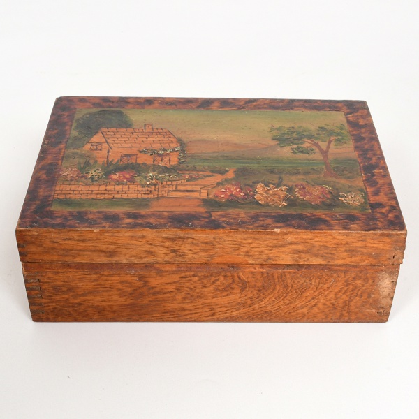 • DIVERSOS, uma (1) caixa retangular, confeccionada em madeira, tampa ornada com paisagem pintada a mão, medindo 19,5 x 13,5 x 6,5 cm, fundo rachado, sinais de uso, vide foto.