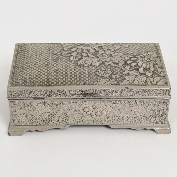 • METAL PRATEADO, uma (1) caixa retangular, ornamentação relevada em elementos vegetalistas, interior forrado em madeira, sem marca de manufatura aparente, medindo 15 x 9 x 5 cm, sinais de uso, vide foto.