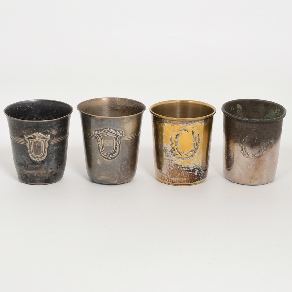 • METAL PRATEADO, quatro (4) copinhos, modelos e manufaturas variadas, todos ligeiramente obcônicos, alguns demandam novo banho em prata, sinais de uso, vide foto.
