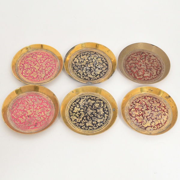 • BRONZE, seis (6) porta copos com ornamentação floral e barrado em zigue-zague, fundo esmaltado, marca de origem Índia em pontilhados, medindo 10 cm diâmetro, sinais de uso, vide foto.