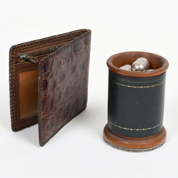 • DIVERSOS, trinta e três (33) itens: 30 bilhas de tamanhos variados; 1 ímã; 1 carteira em couro de crocodilo, fechamento por zíper, medindo fechada 11 x 10 cm, sinais de uso e desgastes; 1 copo para jogar dados, cilíndrico, confeccionado em couro, medindo 9 cm altura, vide foto.