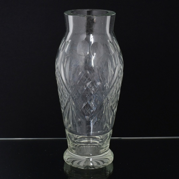 • VIDRO, um (1) vaso incolor e translúcido, formato de balaustre, lapidado em palmas e dedão, fundo estrelado, medindo 21 cm altura, vide foto.
