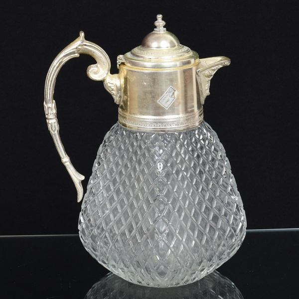 • VIDRO, uma (1) jarra com modelagem geometrizada, incolor e translúcida, formato quase piramidal, monture e alça em metal prateado, relevada em perolados e elementos vegetalistas, interior com recipiente separador de gelo, selo da Roberto Simões, medindo 26 cm altura, sinais de uso, vide foto.