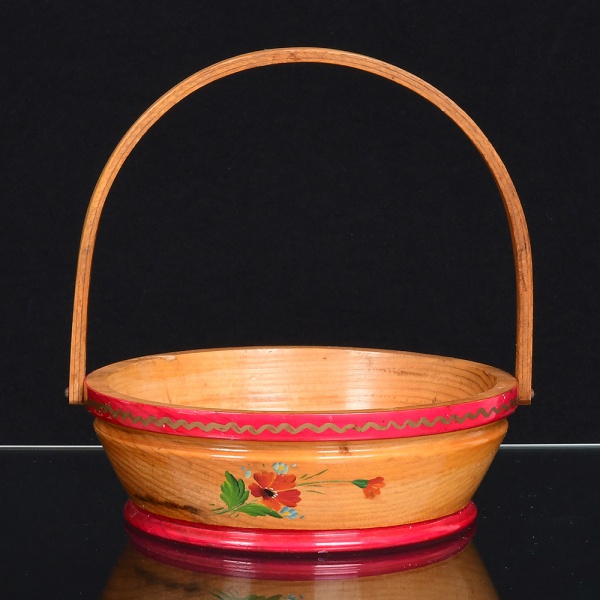 • DIVERSOS, uma (1) cesta com alça, confeccionada em madeira, pintada a mão com flores em policromia, selo parcial da CARLOS ZIPPERER SOBR., Rua Barão do Rio Branco 209, São Bento do Sul, SC, medindo 17,5 cm diâmetro e 19 cm altura até a alça, sinais de uso, vide foto.