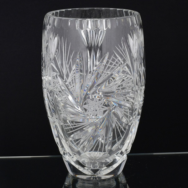 • CRISTAL, um (1) vaso bojudo, lapidado em sulcos, dedão e rosáceas, fundo estrelado, medindo 22,5 cm altura, vide foto.