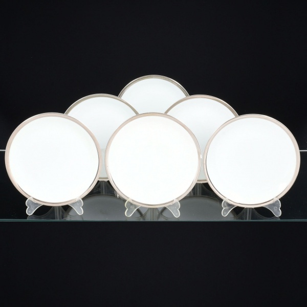 • PORCELANA, seis (6) pratos para sobremesa, tonalidade branca, arremate com friso prateado, medindo 17,5 cm diâmetro mais as alças, modelo MEDAILLON, manufatura RENNER (Porto Alegre, RS, fundada em 1942; em 1998 foi vendida para a Vista Alegre de Portugal; em 1999 mudou a razão social para Vista Alegre do Brasil), íntegros, sinais de uso, vide foto.