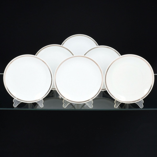 • PORCELANA, seis (6) pratos para sobremesa, tonalidade branca, arremate com friso prateado, medindo 17,5 cm diâmetro mais as alças, modelo MEDAILLON, manufatura RENNER (Porto Alegre, RS, fundada em 1942; em 1998 foi vendida para a Vista Alegre de Portugal; em 1999 mudou a razão social para Vista Alegre do Brasil), um com bicado na borda, sinais de uso, vide foto.