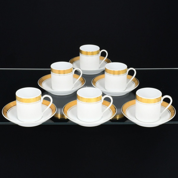 • PORCELANA TAILANDESA, seis (6) xícaras para café, tonalidade branca, arremates a ouro com faixa em guirlanda de folhas e friso, marca ROYAL PORCELAIN  KINGDOM OF THAILAND, não aparentam terem sido usadas ou pouco uso, vide foto.