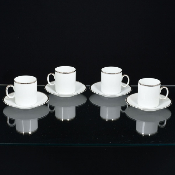 • PORCELANA, quatro (4) xícaras para café, tonalidade branca, arremate com friso prateado, modelo MEDAILLON, manufatura RENNER (Porto Alegre, RS, fundada em 1942; em 1998 foi vendida para a Vista Alegre de Portugal; em 1999 mudou a razão social para Vista Alegre do Brasil), sinais de uso, vide foto.