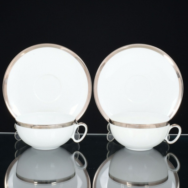 • PORCELANA, par (2) xícaras para chá, tonalidade branca, arremate com friso prateado, modelo MEDAILLON, manufatura RENNER (Porto Alegre, RS, fundada em 1942; em 1998 foi vendida para a Vista Alegre de Portugal; em 1999 mudou a razão social para Vista Alegre do Brasil), sinais de uso, vide foto.